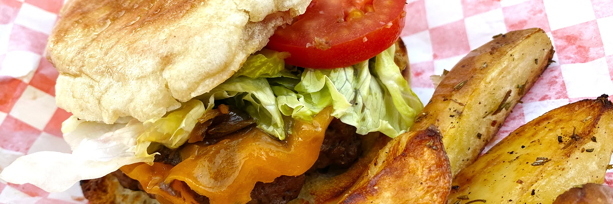 chuck and brisket blend, it’s grilled over mesquite and tucked into a