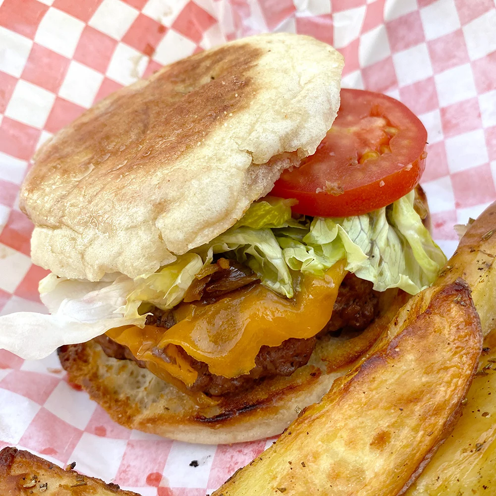 toasty crisp English muffin along with cheddar, lettuce, tomato, pickles