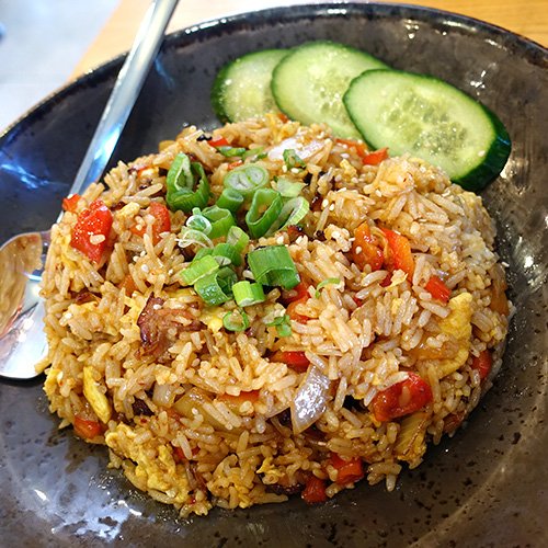 the smoky tartness of the bacon and kimchi fried rice, the red hot
