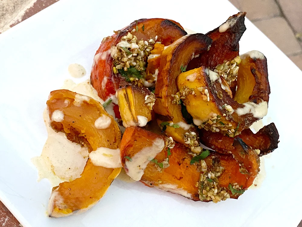 from top left: Roasted red kabocha and delicata squash, tahini,