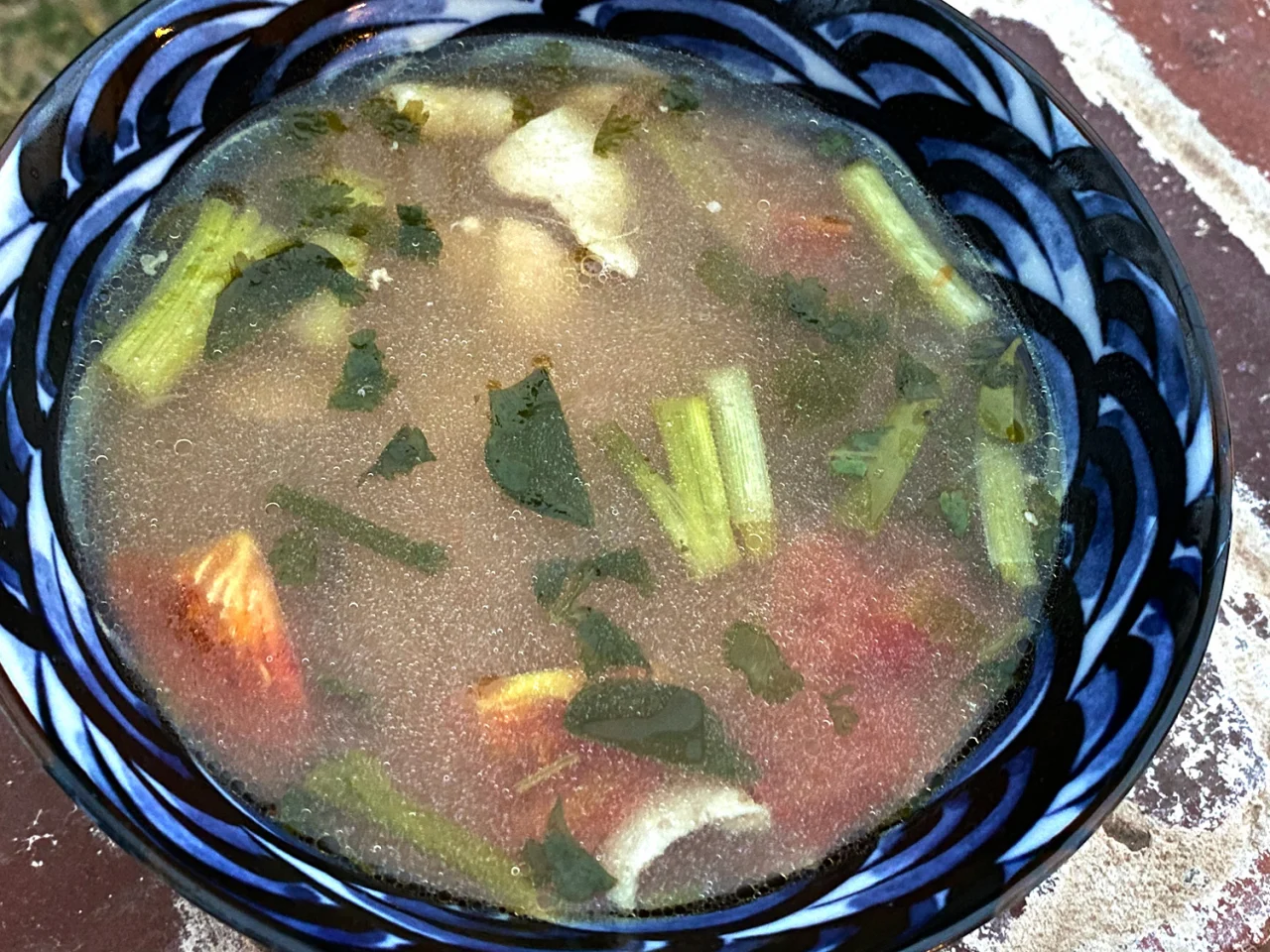 chicken, makrut lime leaf, lemongrass, chile pepper, tomato and shallots