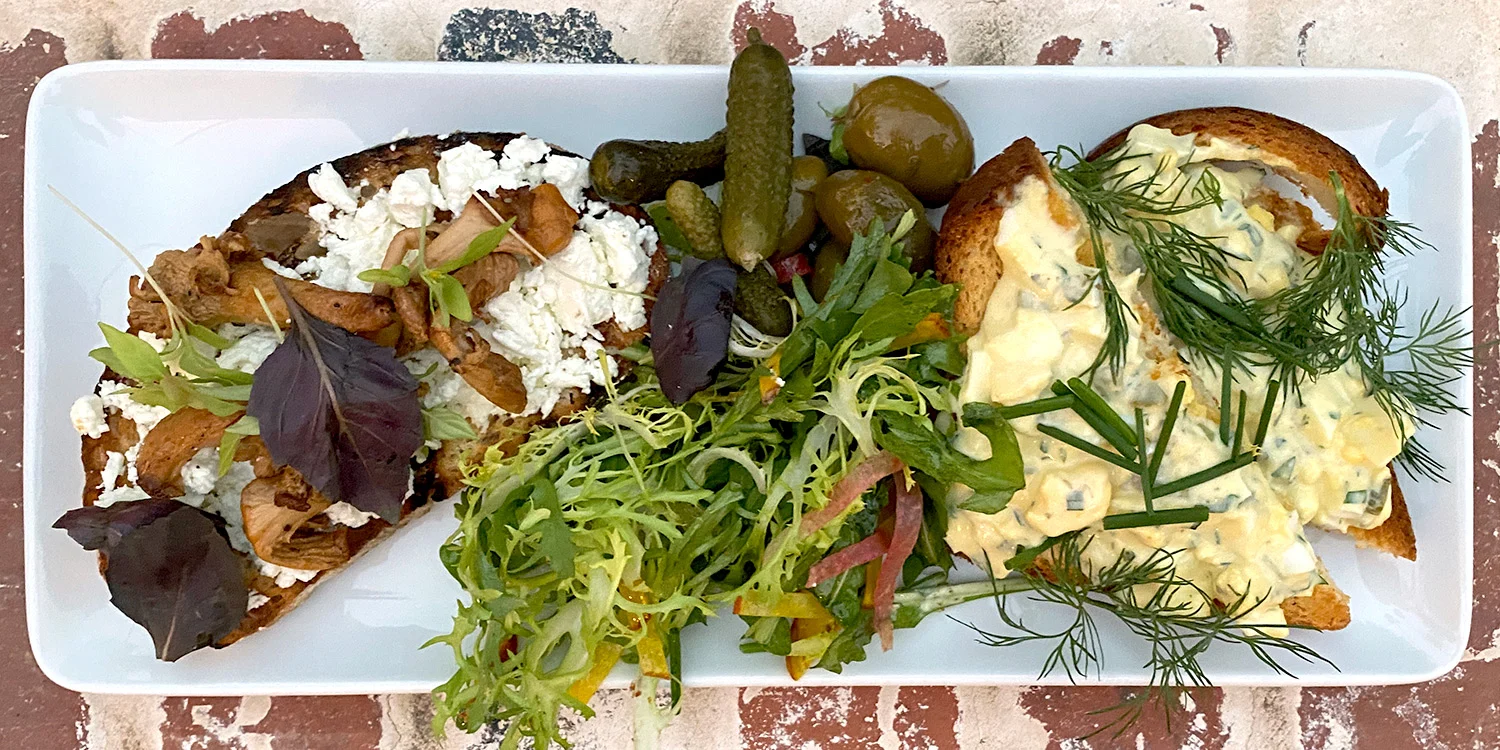 Toast — chanterelles with goat cheese on ciabatta, farm egg salad on brioche, olives, cornichons