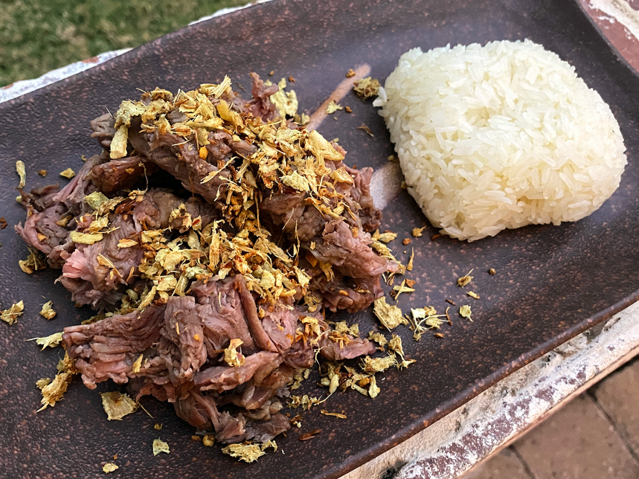 crisp shallots and garlic. You could have had jin toop — marinated beef