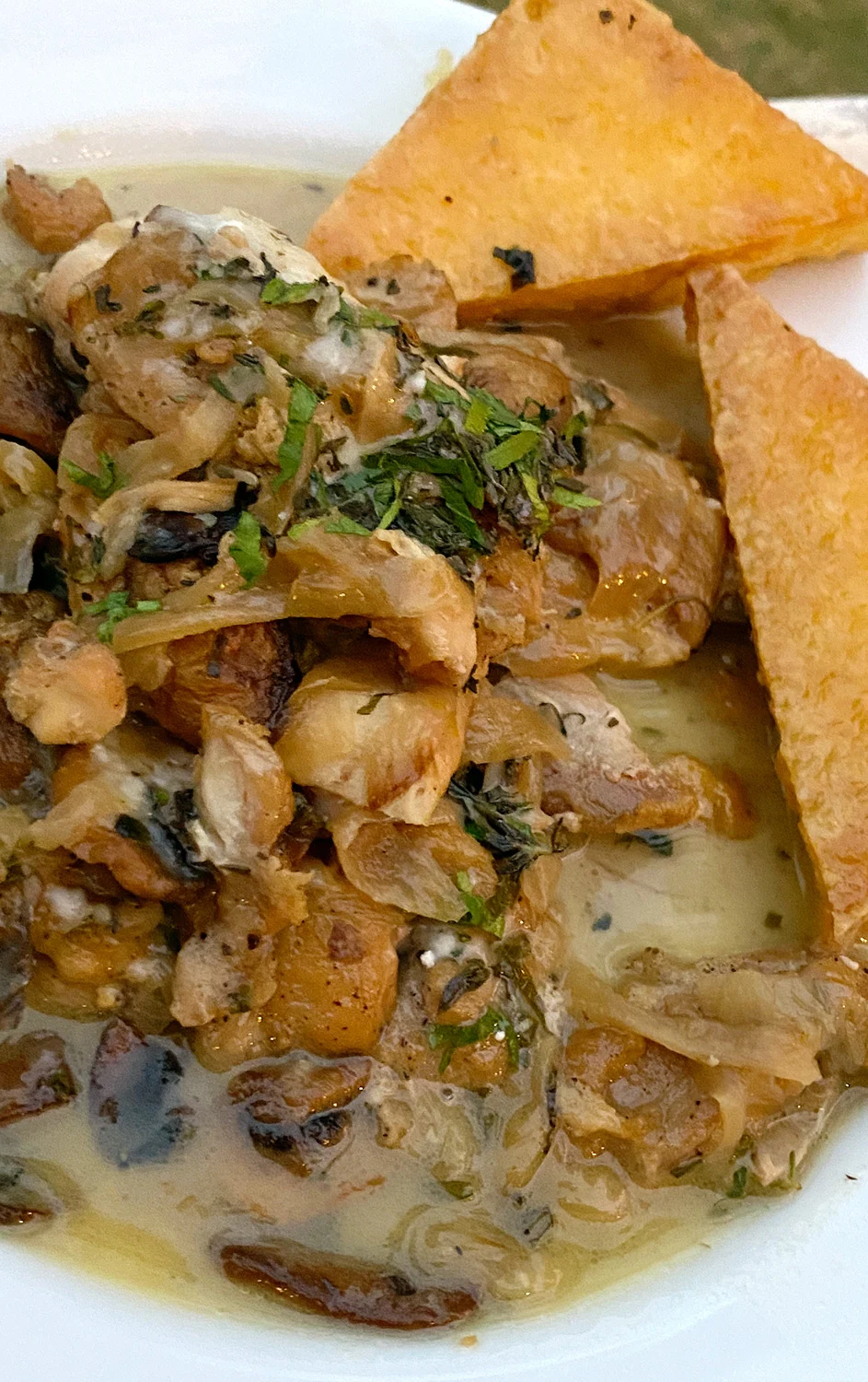 mushrooms, onion, white wine, herbs, crispy polenta, Italian cheese