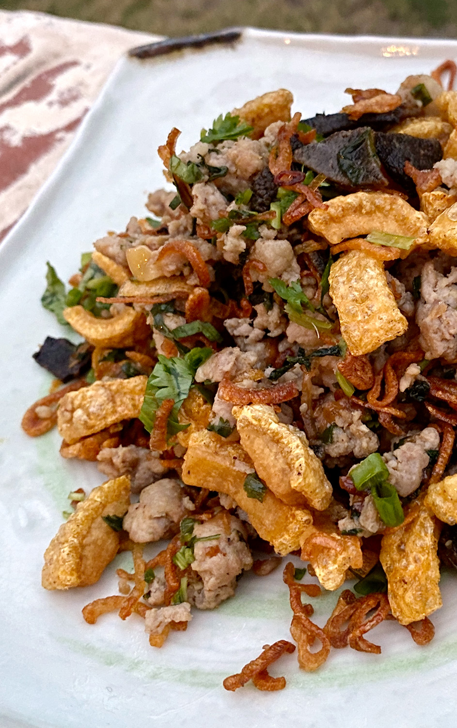 from left: Laap Muang — minced pork, Northern Thai herbs, phak fai,