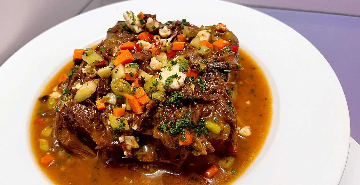 'Italian Beef' with braised oxtail, smoked provolone, Chicago-style giardiniera and brioche