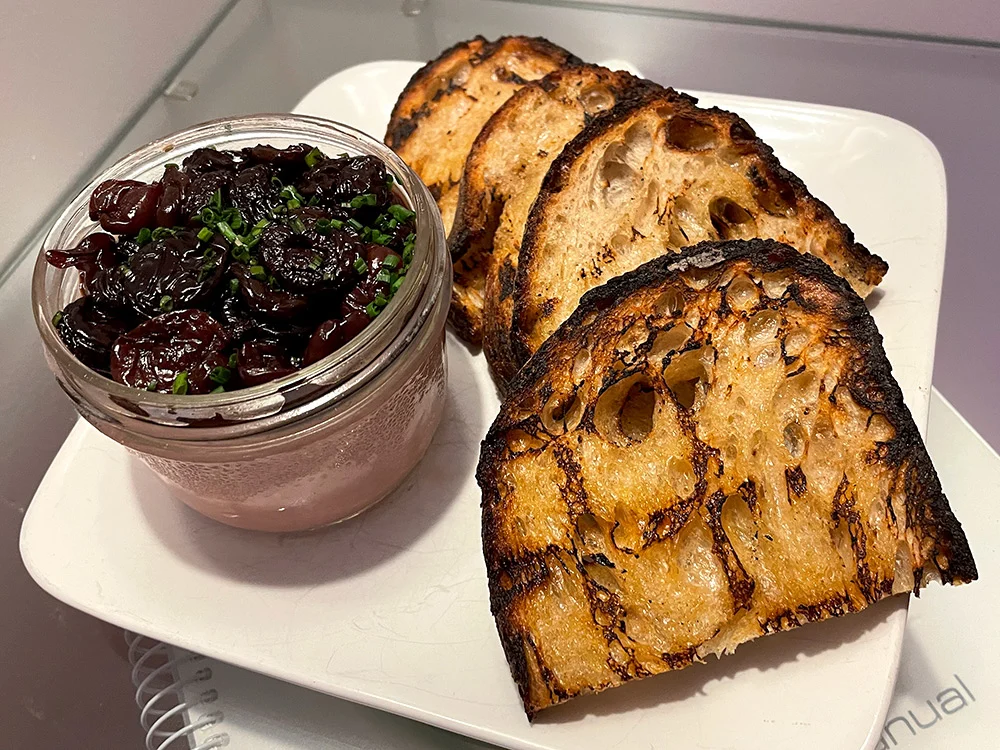 Dom’s still flexing the butcher skills, and chicken liver pate with boozy cherries