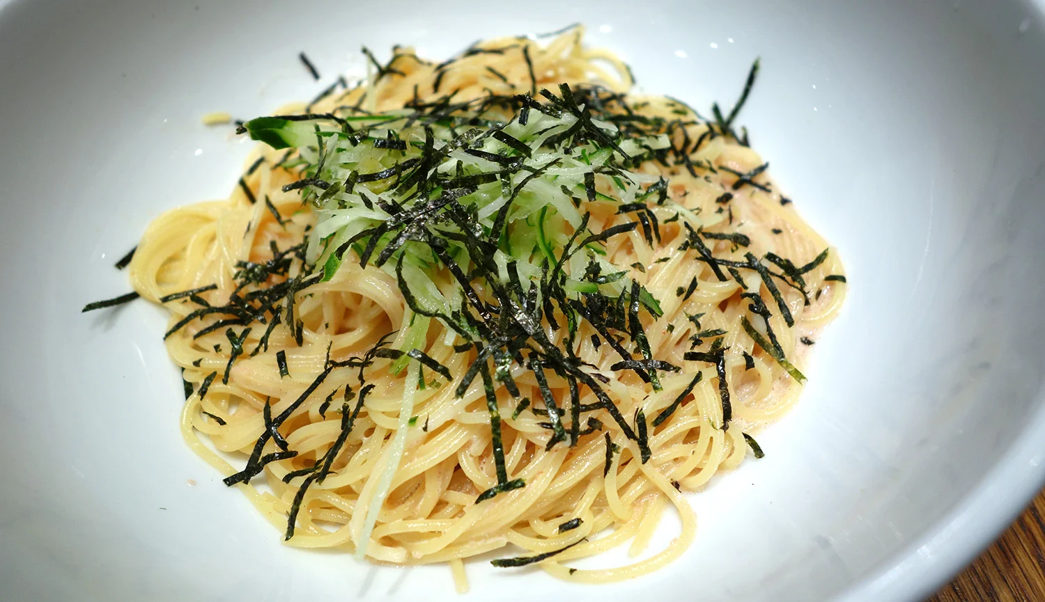 Spicy mentaiko spaghetti with mayonnaise at Spajiro in Tokyo.