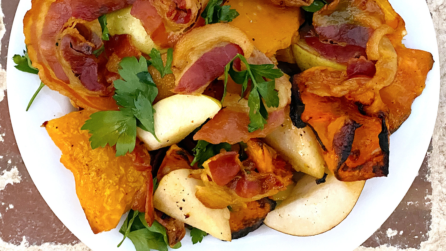 — salt against sweet, a little splash of vinegar, tender squash set against those cool, crunchy pears, crackling pancetta crisps and just a little zip of fresh jalapeño. What I love is that a dish like this seems