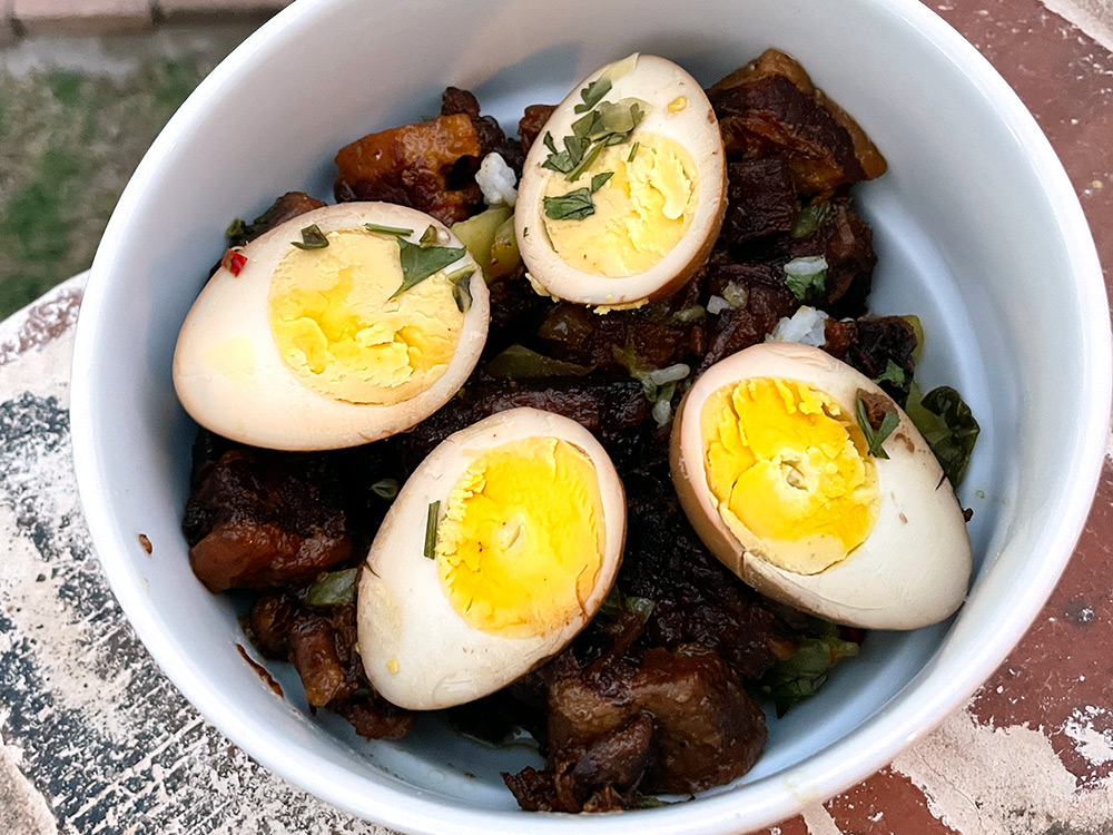 these chicken thighs are stewed to a deep, soy-infused intensity, laden
