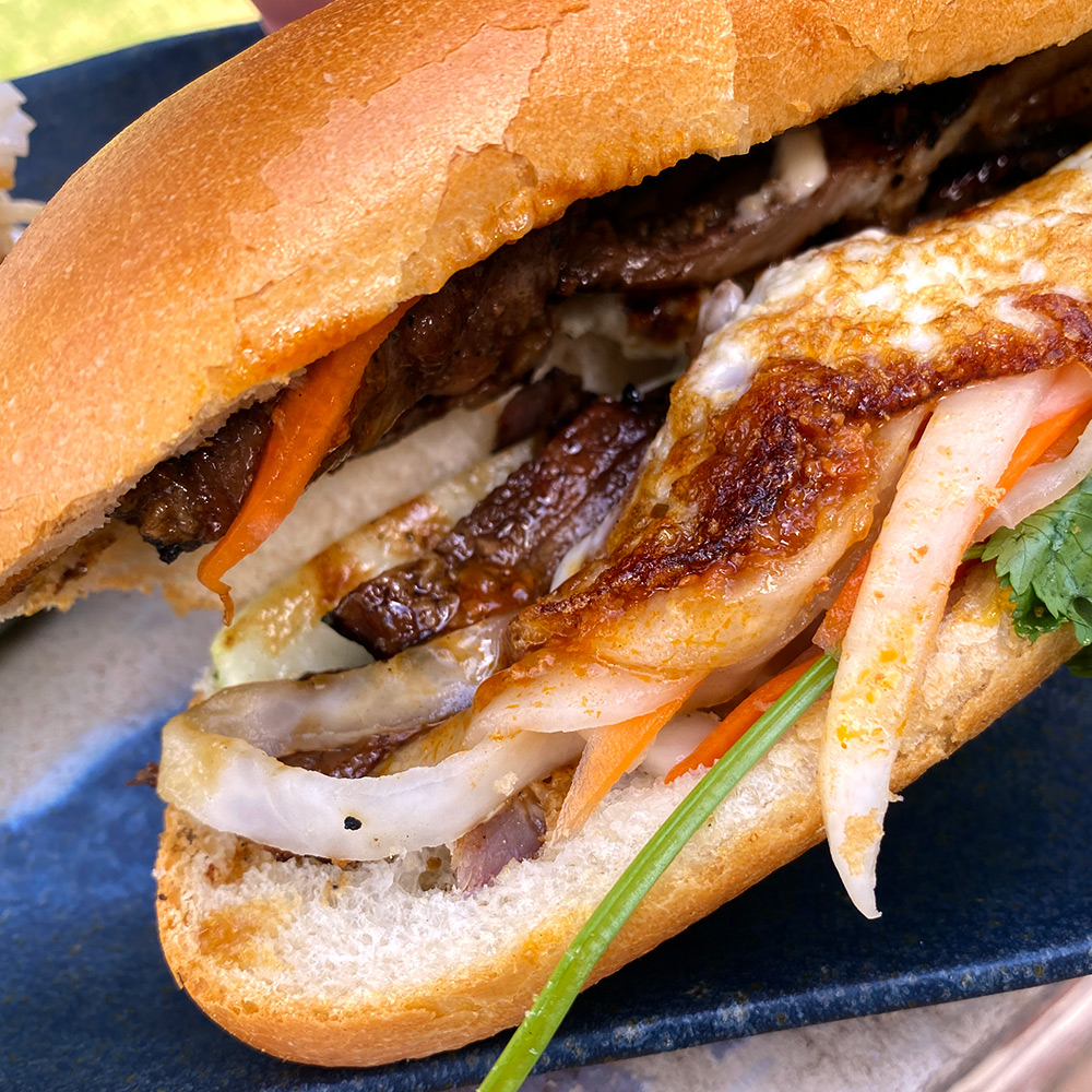 clockwise from left: shaking beef with garlic, onion, butter and soy marinade | fish sauce wings | caramelized pork belly banh mi with an egg