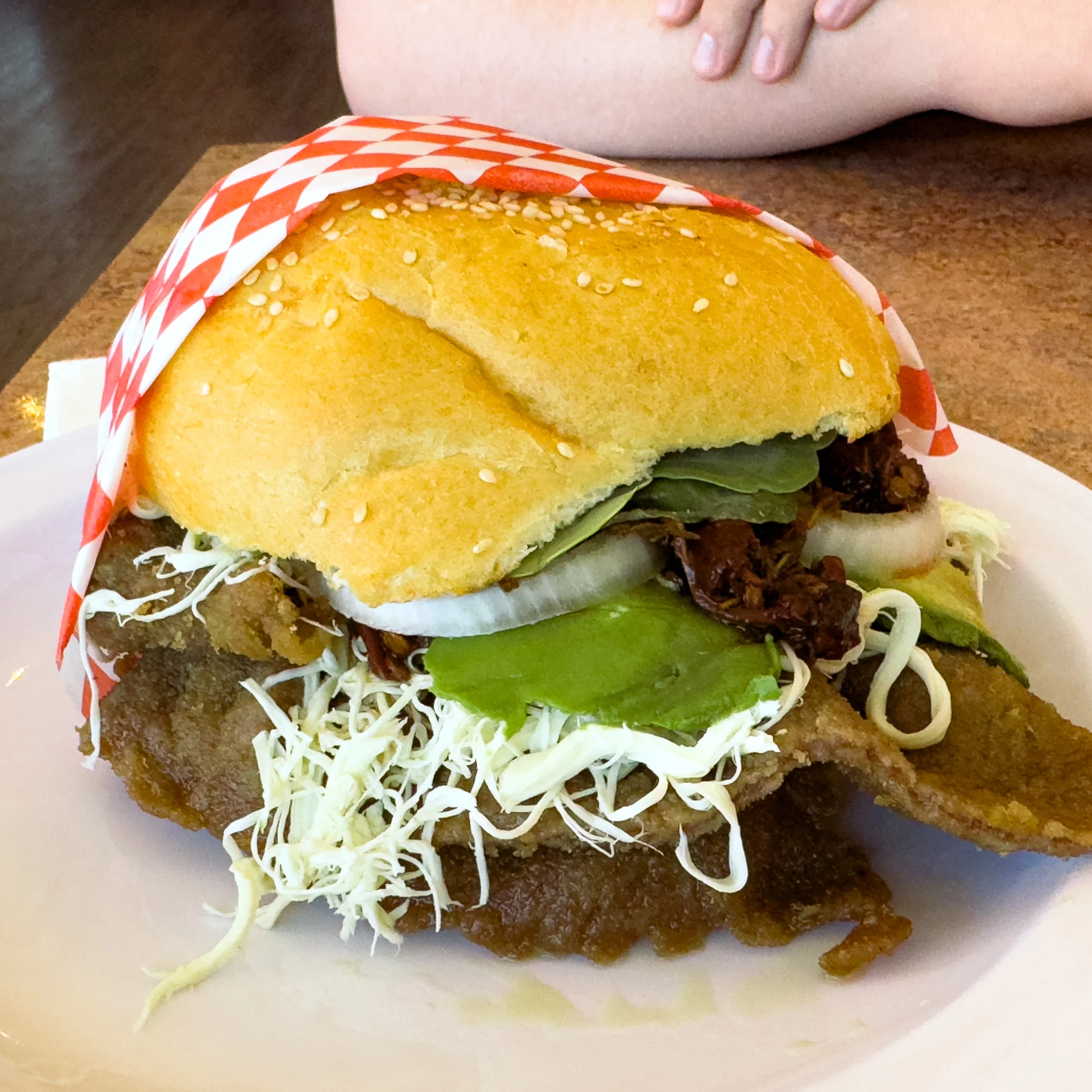 right-from-the-oven sesame-studded bun, piled with avocado, onion, queso