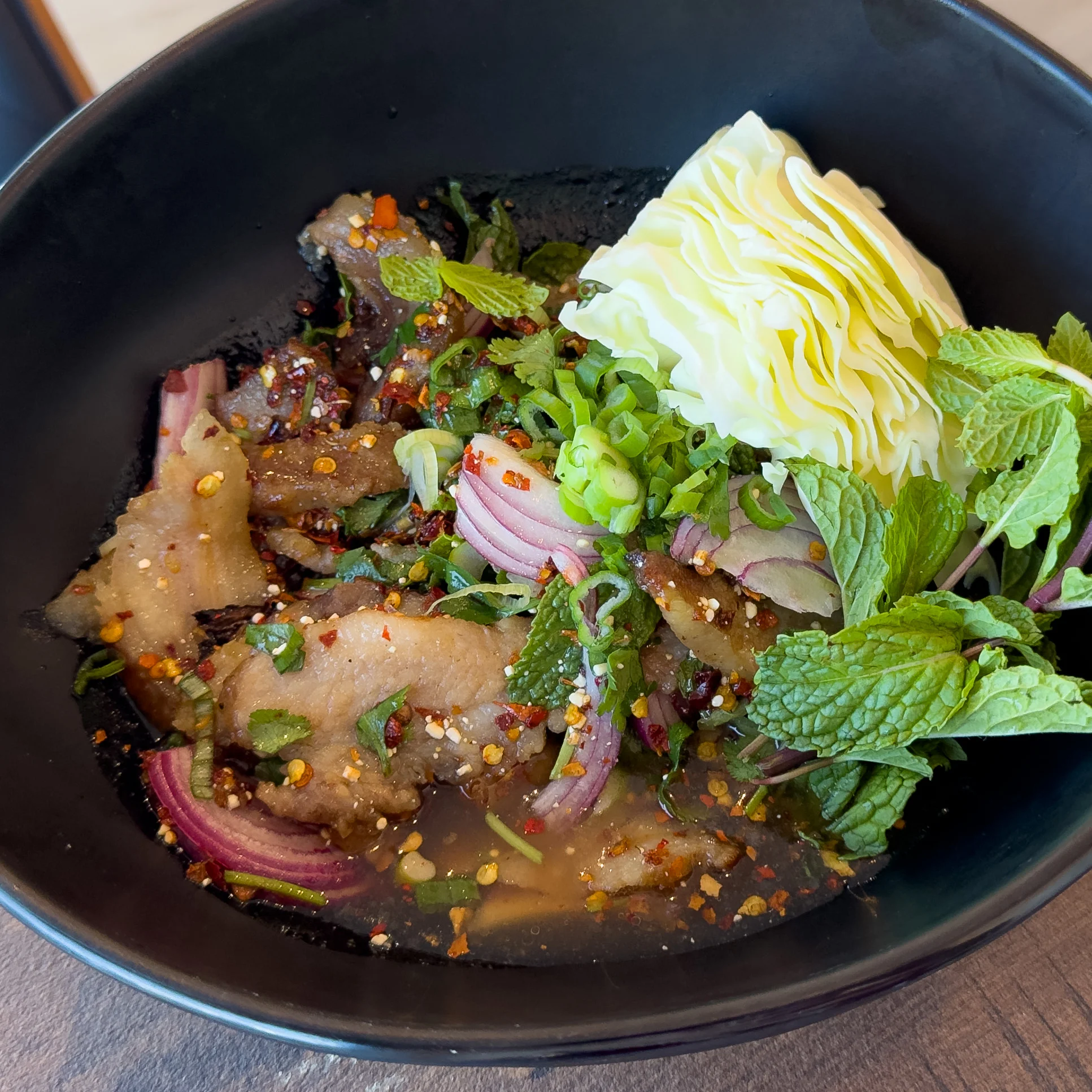moo nam tok — pork jowl salad | Thai sukiyaki hot pot with beef