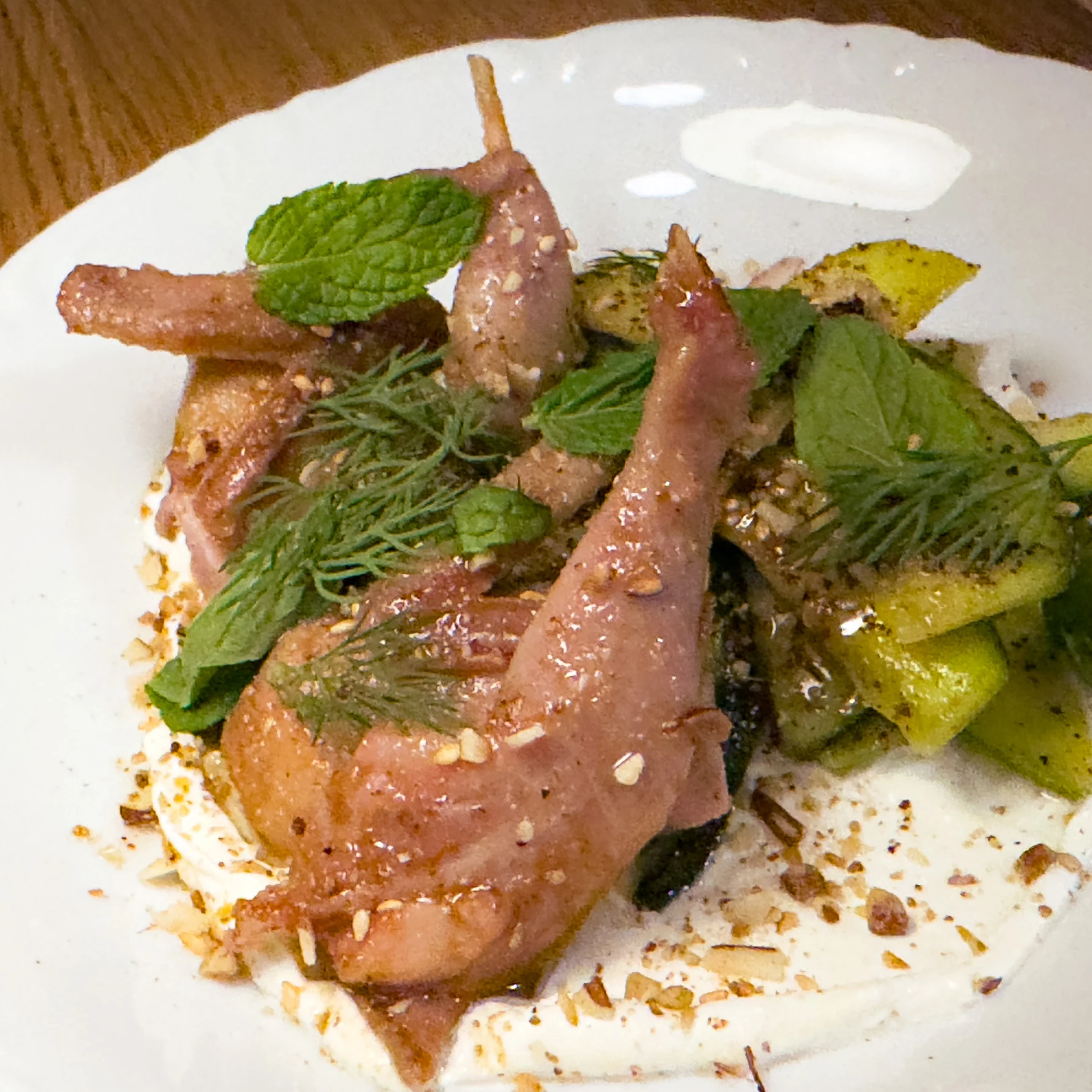 from top left: roasted quail with labneh, sumac squash, dukkah, and
