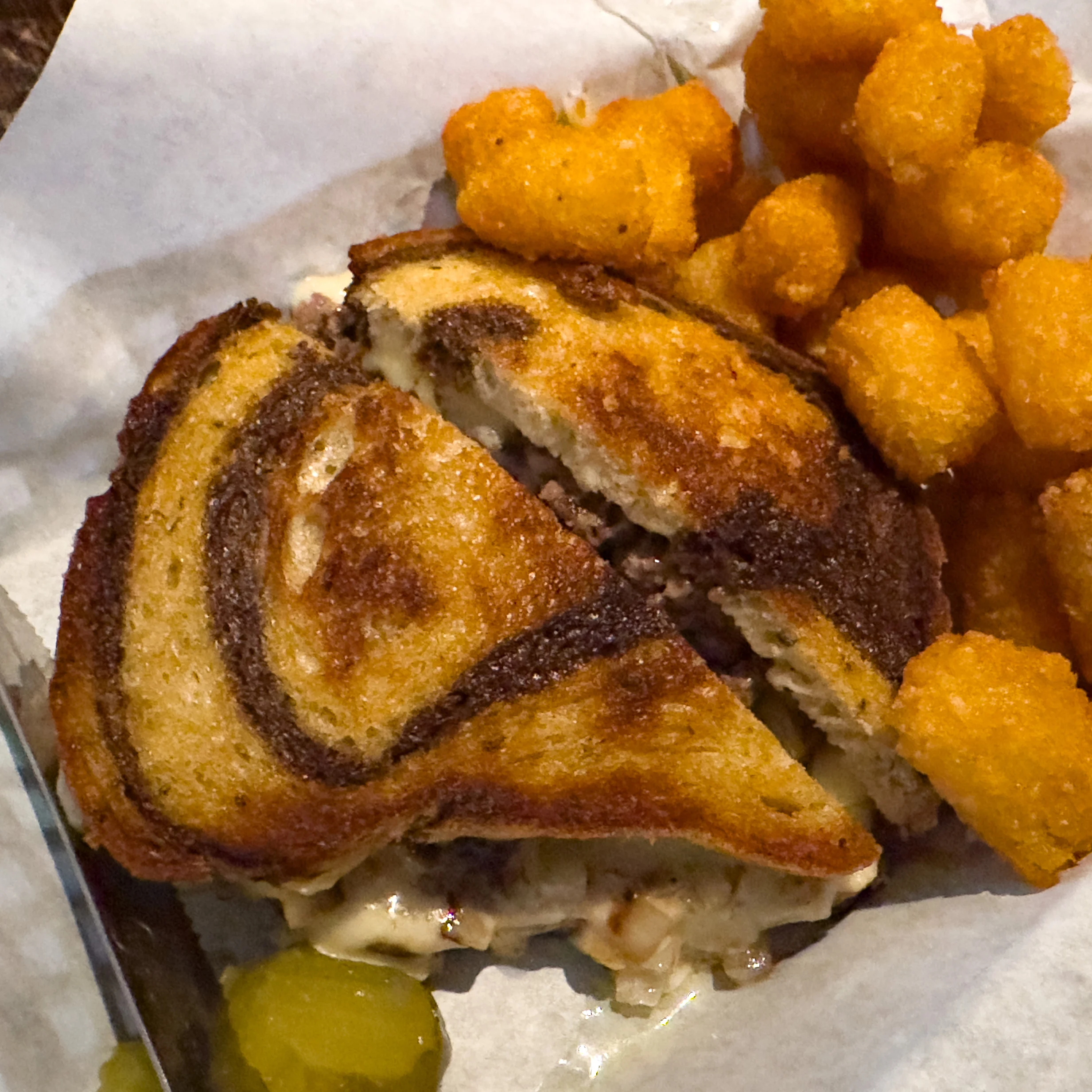ground beef smothered with melted onions and Swiss cheese, tenuously